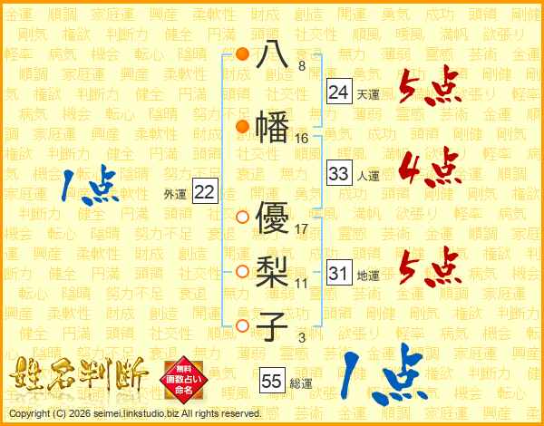 八(8画)幡(16画) 優(17画)梨(11画)子(3画)