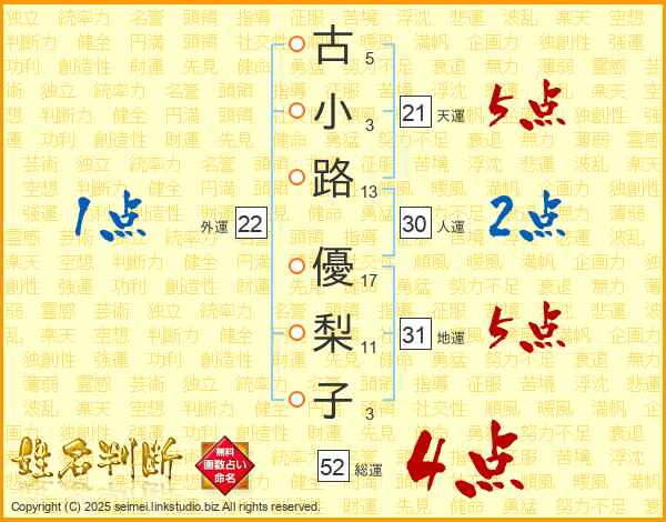 古(5画)小(3画)路(13画) 優(17画)梨(11画)子(3画)