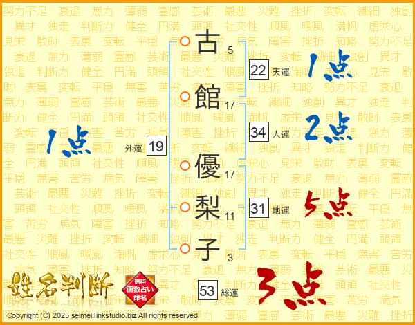古(5画)館(17画) 優(17画)梨(11画)子(3画)