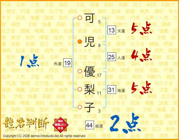 可(5画)児(8画) 優(17画)梨(11画)子(3画)