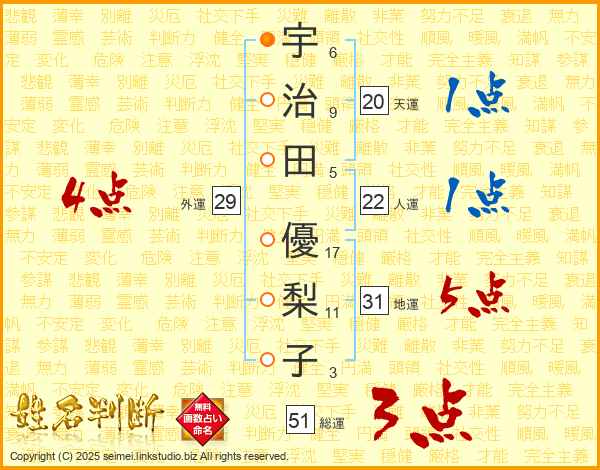 宇(6画)治(9画)田(5画) 優(17画)梨(11画)子(3画)