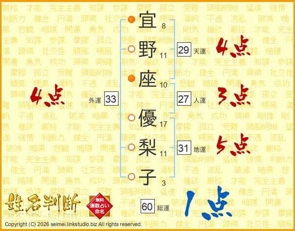 宜(8画)野(11画)座(10画) 優(17画)梨(11画)子(3画)