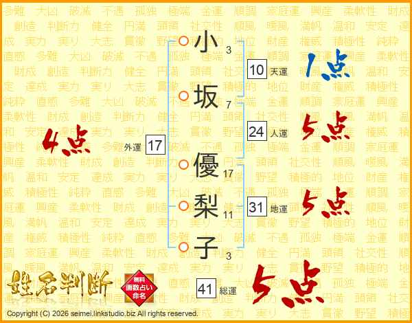 小坂優梨子さんの総運は41画の5点!