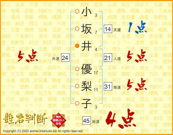 小(3画)坂(7画)井(4画) 優(17画)梨(11画)子(3画)