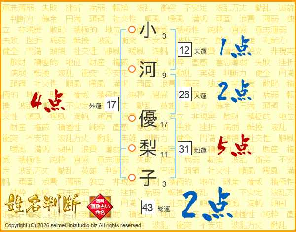 小河優梨子さんの総運は43画の2点!
