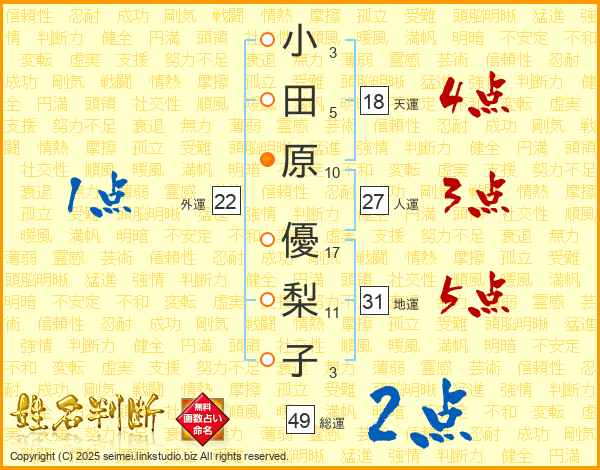 小(3画)田(5画)原(10画) 優(17画)梨(11画)子(3画)