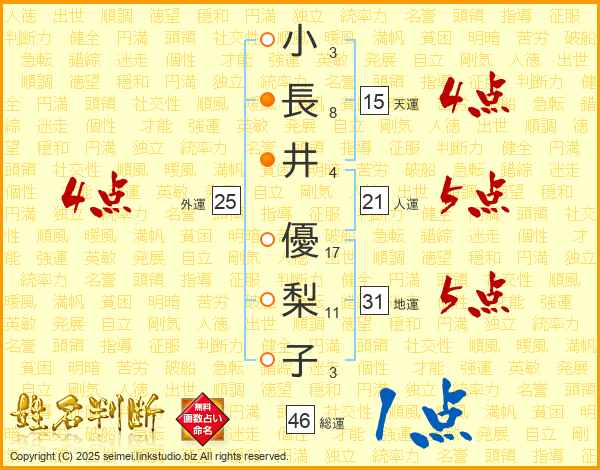 小(3画)長(8画)井(4画) 優(17画)梨(11画)子(3画)