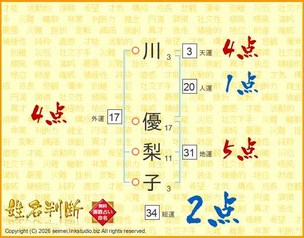 川(3画) 優(17画)梨(11画)子(3画)