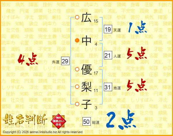広(15画)中(4画) 優(17画)梨(11画)子(3画)
