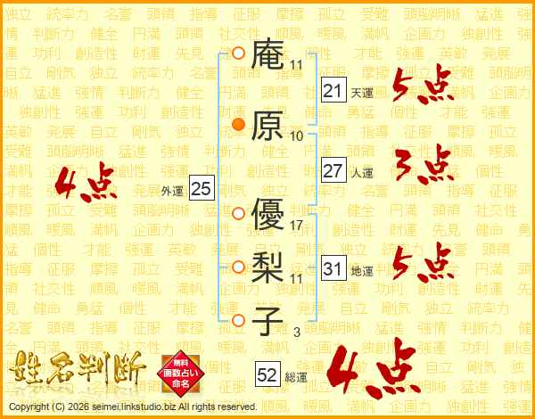 庵(11画)原(10画) 優(17画)梨(11画)子(3画)