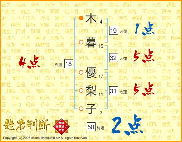 木(4画)暮(15画) 優(17画)梨(11画)子(3画)