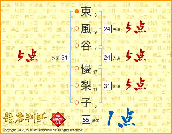 東(8画)風(9画)谷(7画) 優(17画)梨(11画)子(3画)
