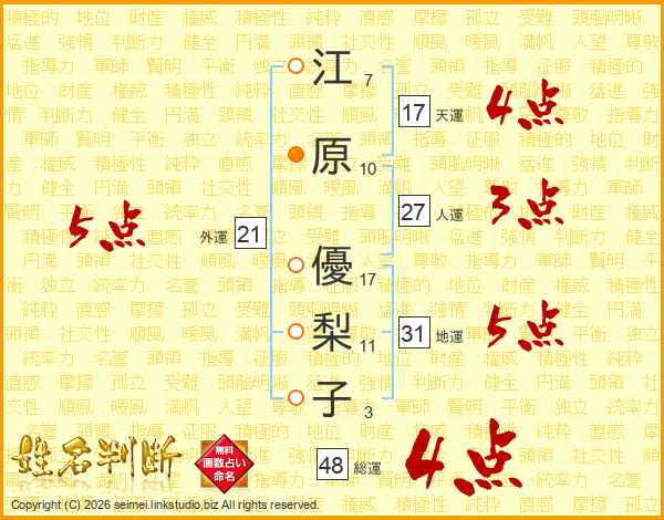 江(7画)原(10画) 優(17画)梨(11画)子(3画)