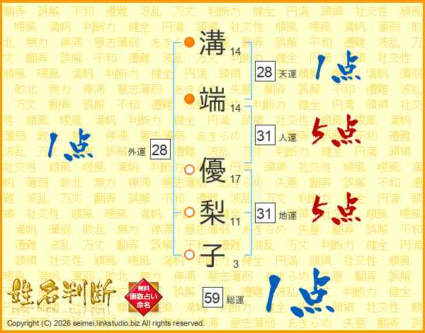 溝(14画)端(14画) 優(17画)梨(11画)子(3画)