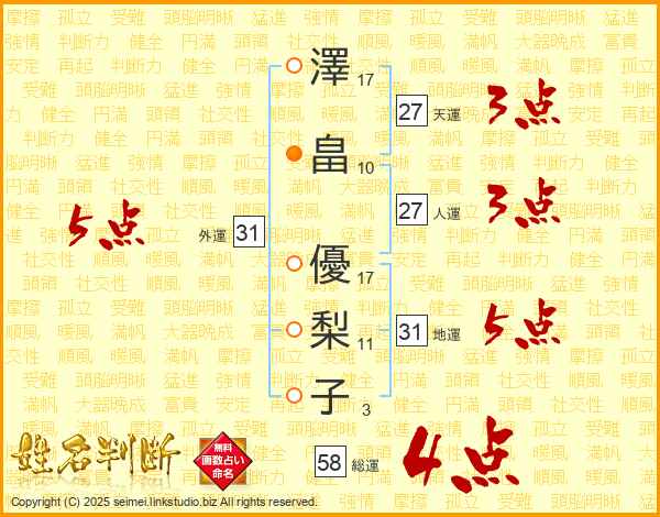 澤畠優梨子さんの総運は58画の4点!