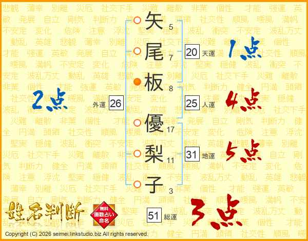 矢(5画)尾(7画)板(8画) 優(17画)梨(11画)子(3画)