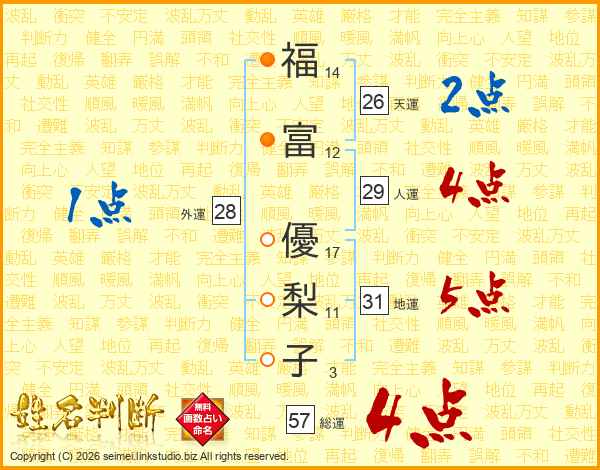 福(14画)富(12画) 優(17画)梨(11画)子(3画)
