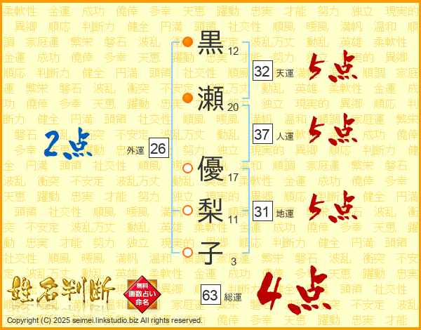 黒(12画)瀬(20画) 優(17画)梨(11画)子(3画)