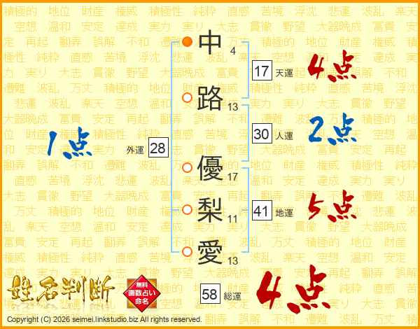 中(4画)路(13画) 優(17画)梨(11画)愛(13画)