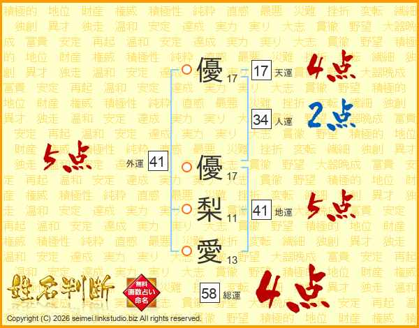 優優梨愛さんの総運は58画の4点!
