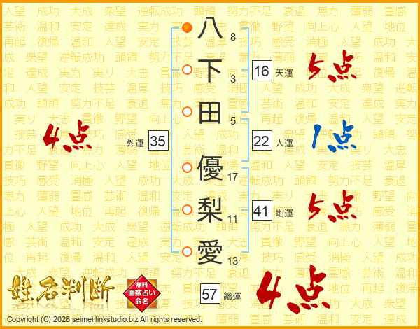 八(8画)下(3画)田(5画) 優(17画)梨(11画)愛(13画)