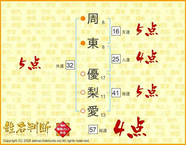 周(8画)東(8画) 優(17画)梨(11画)愛(13画)