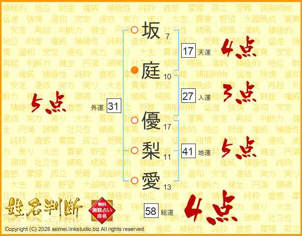 坂(7画)庭(10画) 優(17画)梨(11画)愛(13画)