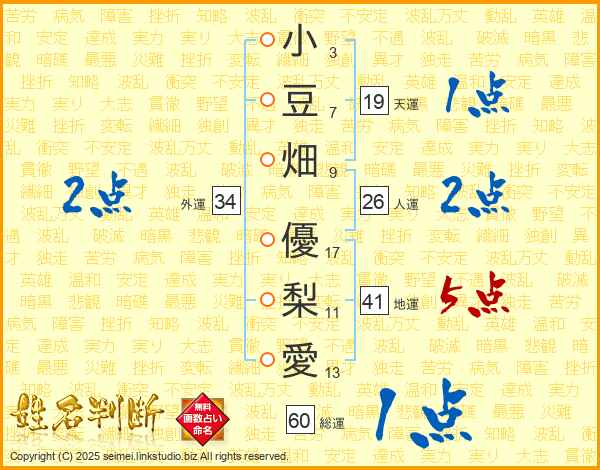 小(3画)豆(7画)畑(9画) 優(17画)梨(11画)愛(13画)