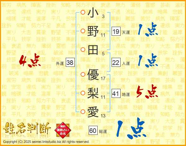 小(3画)野(11画)田(5画) 優(17画)梨(11画)愛(13画)