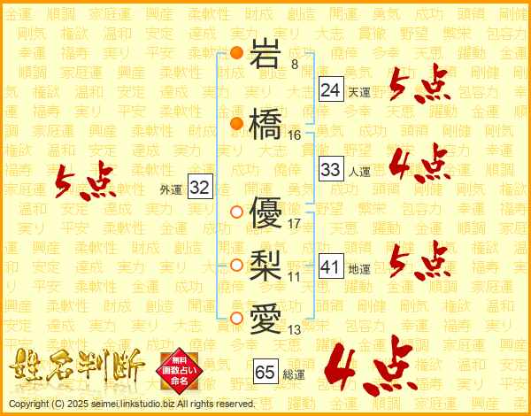 岩橋優梨愛さんの総運は65画の4点!