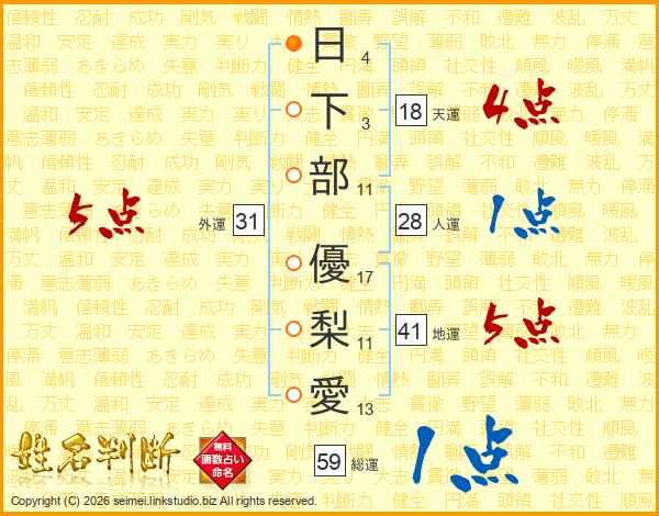 日(4画)下(3画)部(11画) 優(17画)梨(11画)愛(13画)