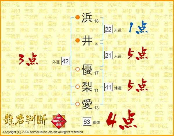 浜井優梨愛さんの総運は63画の4点!