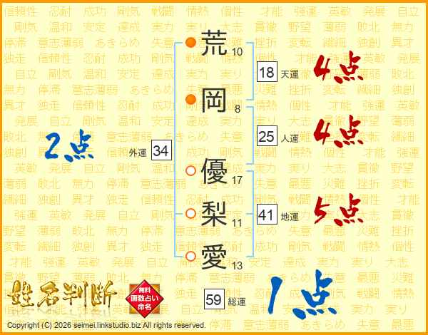 荒岡優梨愛さんの人運は25画の4点!
