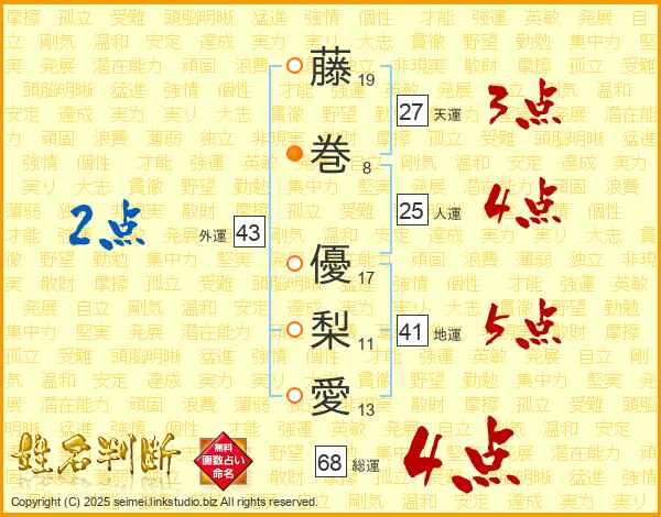 藤(19画)巻(8画) 優(17画)梨(11画)愛(13画)