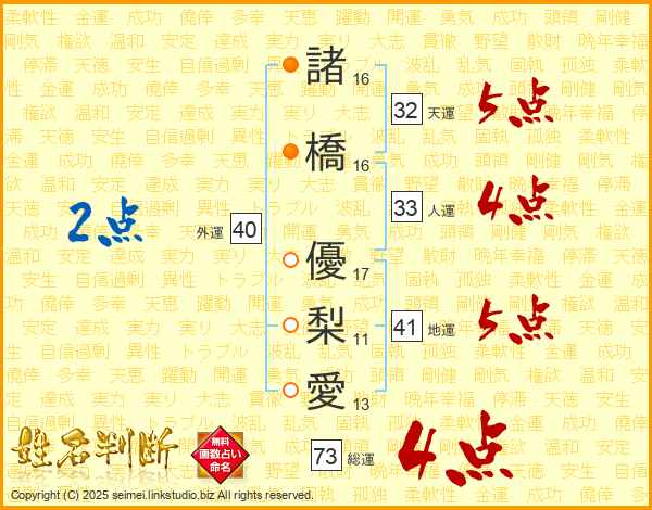 諸(16画)橋(16画) 優(17画)梨(11画)愛(13画)