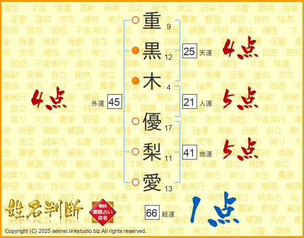 重(9画)黒(12画)木(4画) 優(17画)梨(11画)愛(13画)