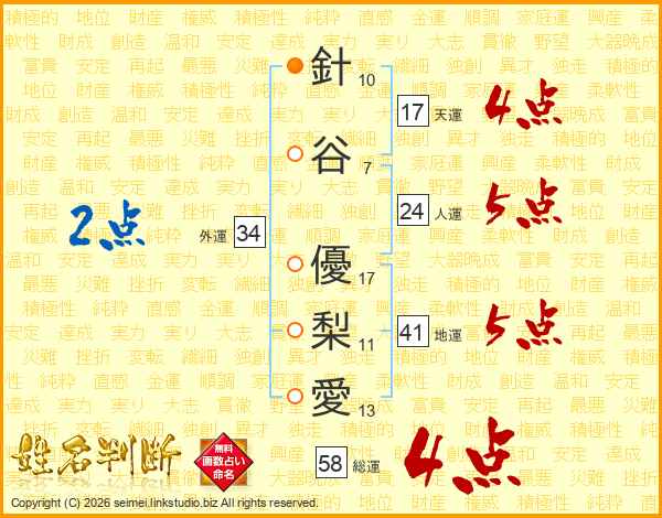 針(10画)谷(7画) 優(17画)梨(11画)愛(13画)