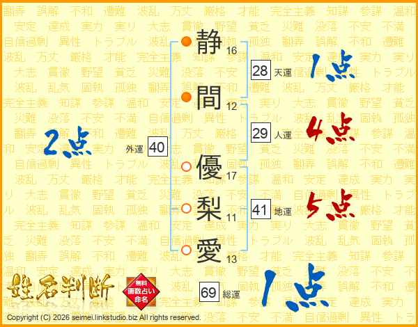 静(16画)間(12画) 優(17画)梨(11画)愛(13画)