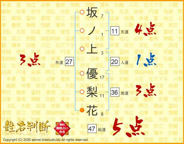 坂(7画)ノ(1画)上(3画) 優(17画)梨(11画)花(8画)