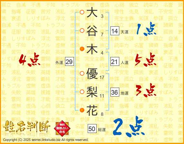 大(3画)谷(7画)木(4画) 優(17画)梨(11画)花(8画)