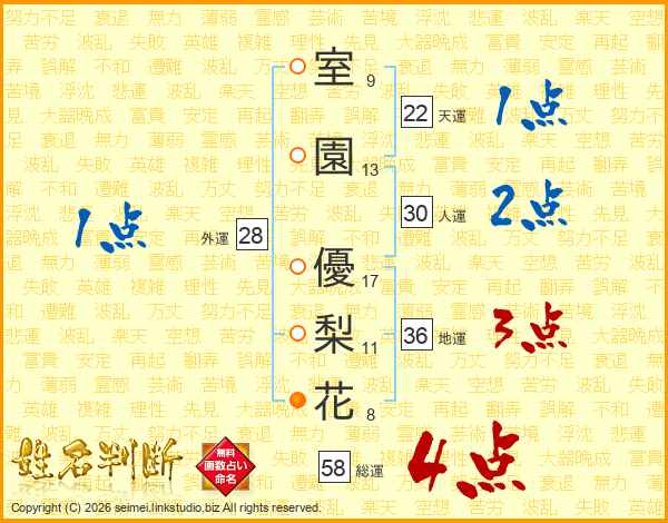 室園優梨花さんの総運は58画の4点!