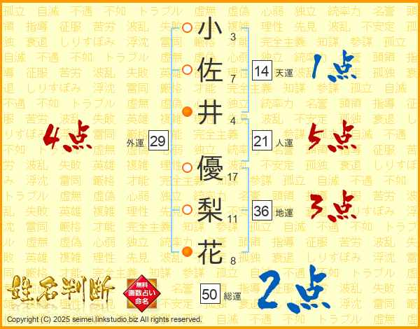 小(3画)佐(7画)井(4画) 優(17画)梨(11画)花(8画)