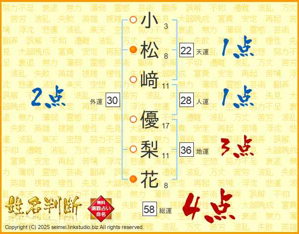 小(3画)松(8画)﨑(11画) 優(17画)梨(11画)花(8画)