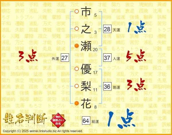市(5画)之(3画)瀬(20画) 優(17画)梨(11画)花(8画)