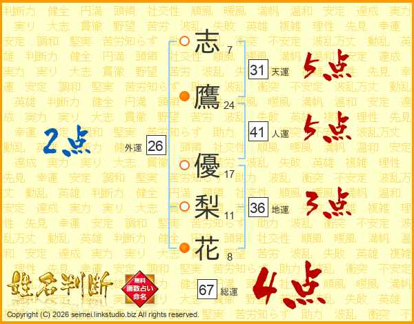 志(7画)鷹(24画) 優(17画)梨(11画)花(8画)
