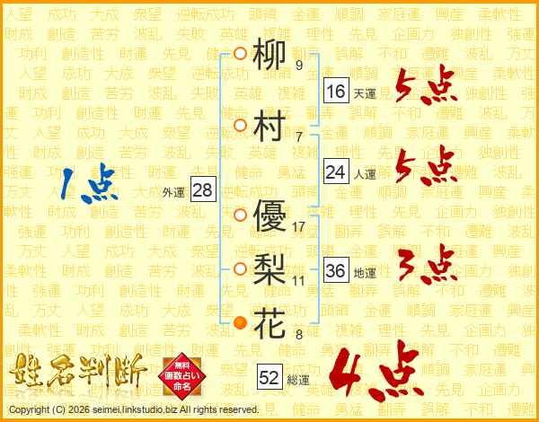 柳(9画)村(7画) 優(17画)梨(11画)花(8画)