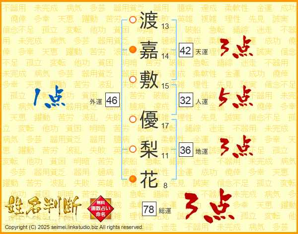 渡(13画)嘉(14画)敷(15画) 優(17画)梨(11画)花(8画)