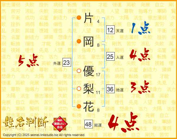 片(4画)岡(8画) 優(17画)梨(11画)花(8画)
