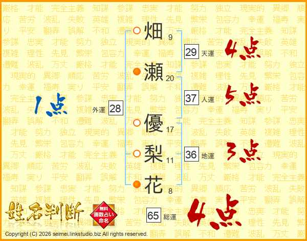 畑(9画)瀬(20画) 優(17画)梨(11画)花(8画)