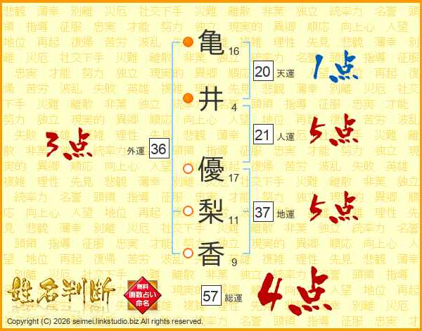 亀(16画)井(4画) 優(17画)梨(11画)香(9画)